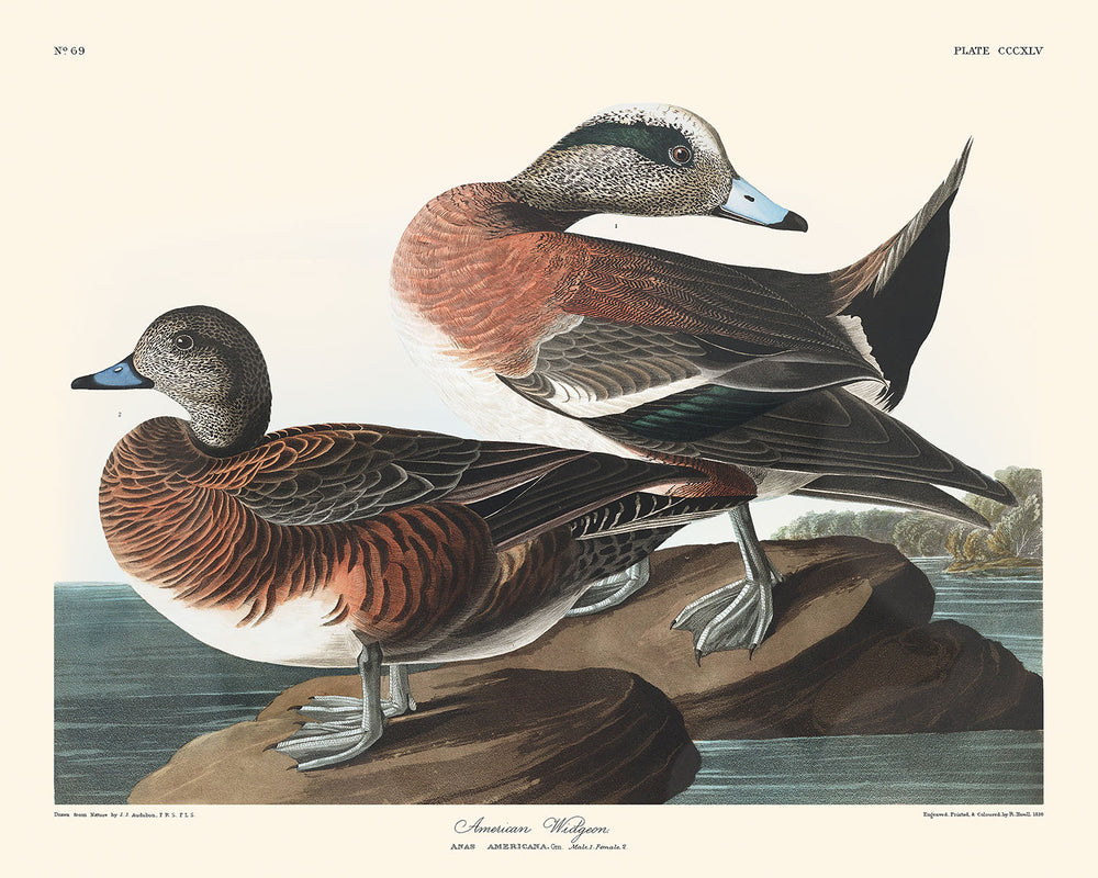 "American Widgeon (Plate 345)," first published in 1827, is a lively and beautifully detailed illustration from John James Audubon's iconic series, The Birds of America. This piece is a captivating exploration of the American Widgeon, a duck that is highly regarded for its juicy flesh and diverse habitats across the United States, from New Orleans to the Gulf of Mexico.