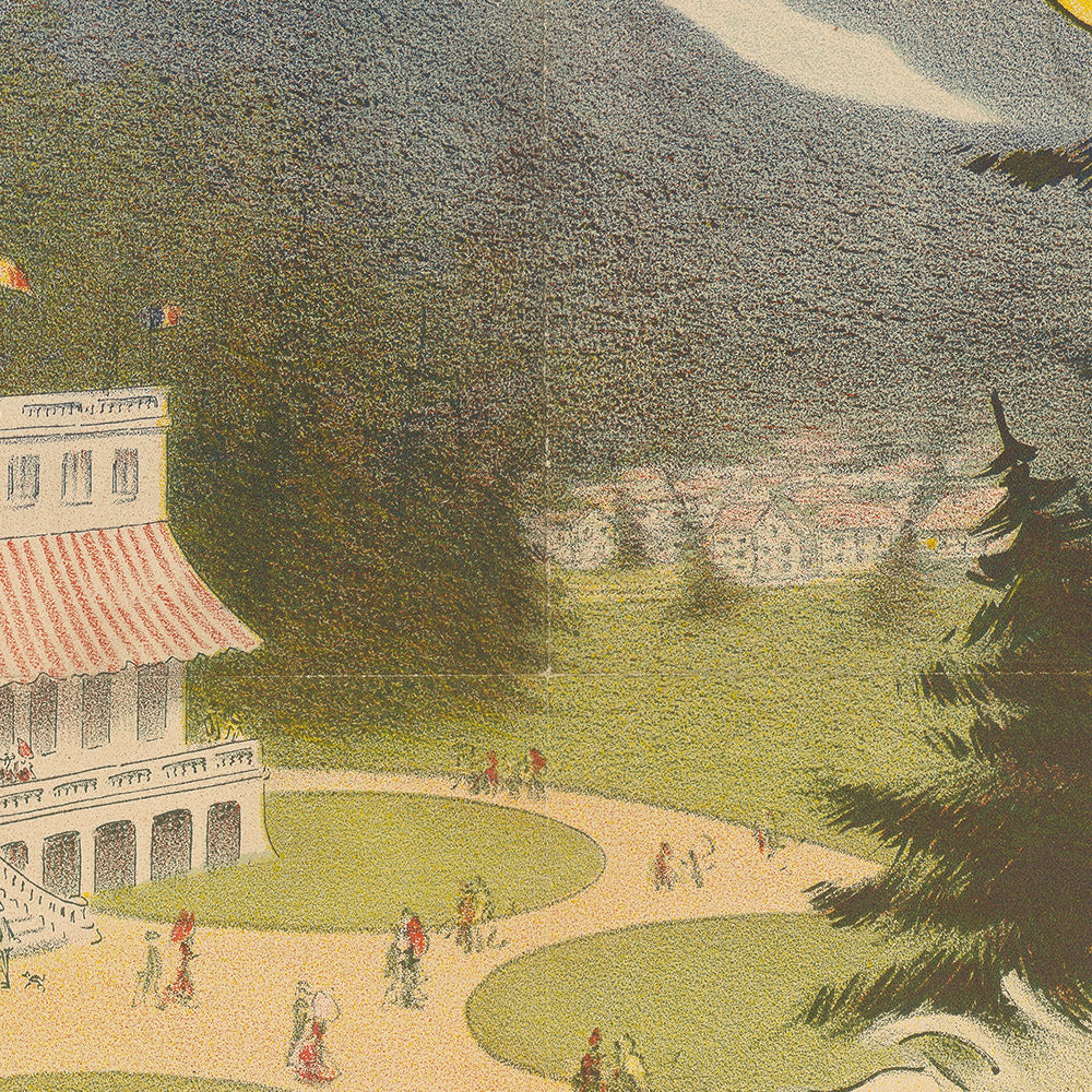 Grand Casino municipal de Chamonix by René Péan, created in 1905, captures the glittering allure of the Belle Époque in the shadow of Mont Blanc. Issued at a time when rail travel was opening the French Alps to fashionable tourists, this antique travel poster promotes Chamonix’s municipal casino—the social heart of the resort—where concerts, gaming, and soirées animated long summer evenings and snow-bright winter days. On the sheet, a sweep of crimson lettering crowns the composition against a creamy ground, with cool blue tones suggesting the Alpine horizon and mustard-yellow accents lending a warm, theatrical glow.