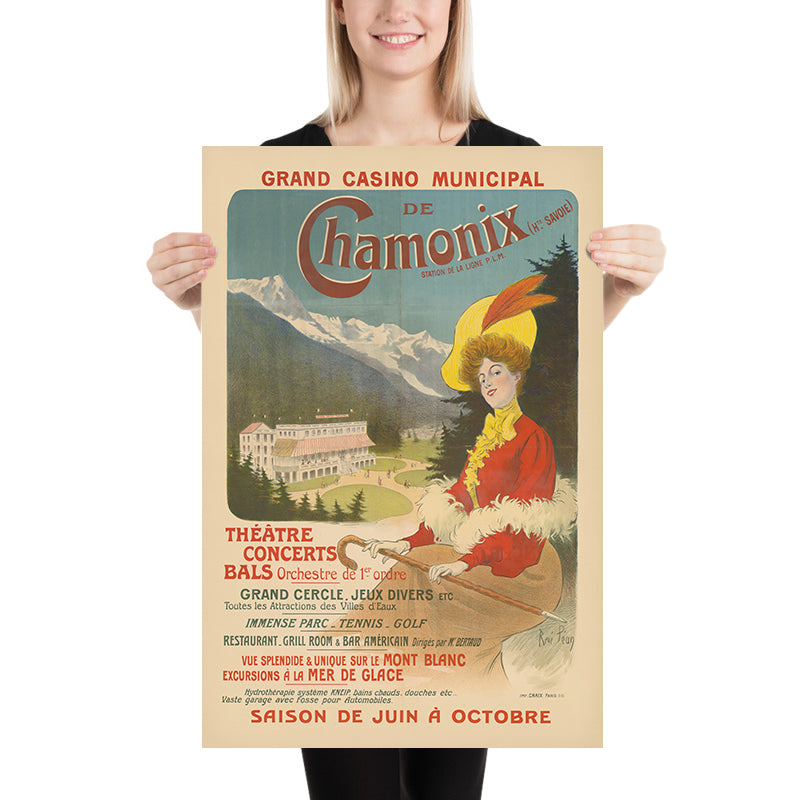 Chamonix, nestled in Haute-Savoie at the foot of Mont Blanc, was already a destination for mountaineers by 1905, but it was the broader culture of Alpine leisure—grand hotels, promenades, and, notably, the casino—that turned the valley into a cosmopolitan playground. Posters like this one were more than advertisements; they were aspirational windows inviting viewers to swap the city for clean air, glittering nights, and grand company. Displayed today, the piece evokes that early age of travel—steam trains, refined dress, and the thrill of arriving somewhere extraordinary.