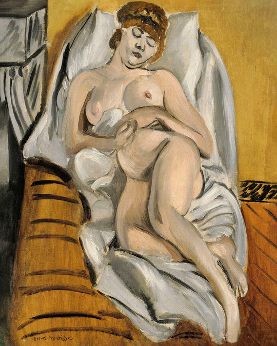 Henri Matisse is celebrated for his ability to transform simple lines and colors into profound expressions of emotion. "Femme nue" is notable for its minimalist style, emphasizing fluid forms and the elegance of the human shape. The painting’s palette, dominated by shades of yellow, beige, and white, creates a warm and inviting impression. The subtle play of light within these colors evokes a sense of serenity and timeless beauty, a characteristic signature of Matisse's work.