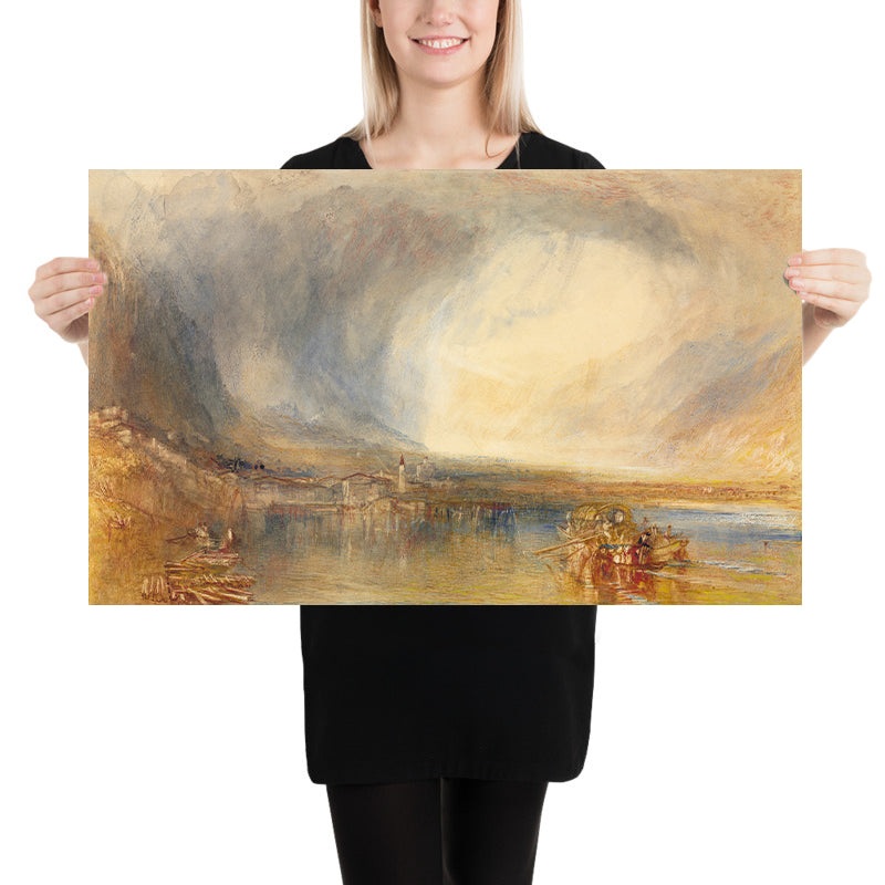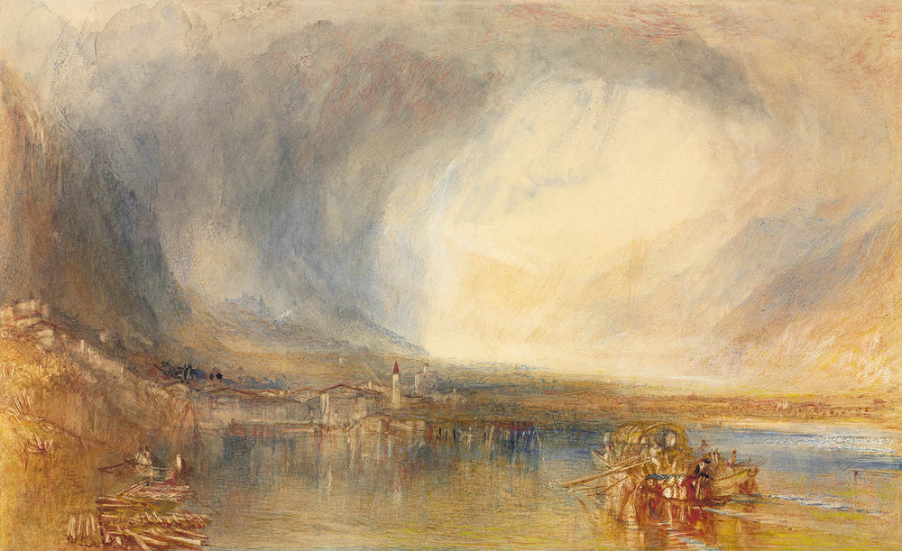 Flüelen, from the Lake of Lucerne by Turner (1845) evokes the stillness and wonder of Switzerland’s highland waters at daybreak. A leading light of Romanticism, Turner transformed landscape into pure sensation, rendering weather, distance, and reflection as the true subjects of the scene. Here, a lakeside village reclines beneath an Alpine horizon as mist lifts and sunlight begins to thread across the water—an intimately scaled vision that distills the sublime into color and air.
