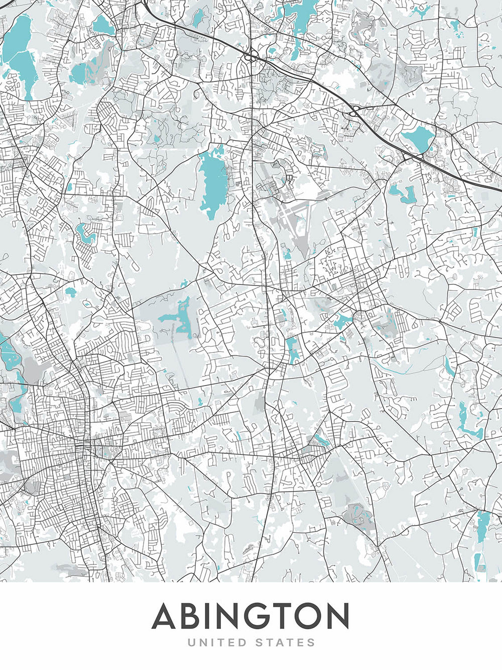 This Abington map is a modern, detailed street map without labels, created by The Unique Maps Co. in 2024. It focuses on the city of Abington in Massachusetts, and the surrounding areas, providing an accurate and visually appealing representation of the city and its surroundings. The map covers a significant portion of the city, including the city center, residential neighborhoods, commercial areas, and nearby towns.