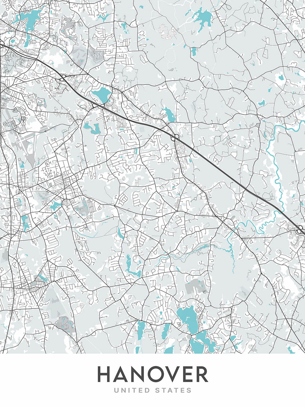 This modern map of Hanover, Massachusetts, created by The Unique Maps Co. in 2024, is a detailed and visually striking piece of art that captures the essence of this charming town. The map covers a substantial area, extending approximately 9 miles to the north and south of the town center and 7.5 miles to the east and west, encompassing a diverse range of neighborhoods, landmarks, and natural features.