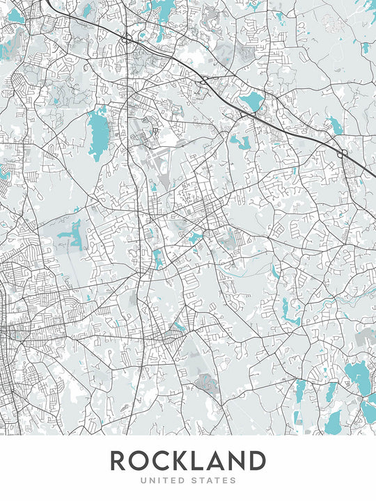 This original creation by The Unique Maps Co. features unique cartography, modern design, and a distinctive color palette. The map's intricate details capture the essence of Rockland's urban environment, making it a visually appealing and informative piece. The use of modern design principles ensures that the map is both aesthetically pleasing and easy to navigate, providing users with a user-friendly experience.