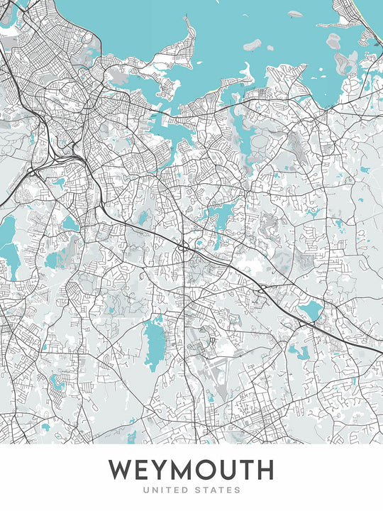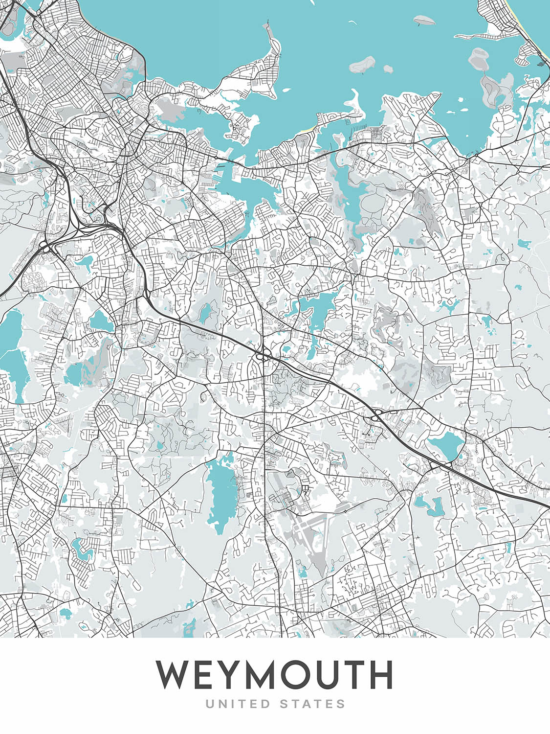 This Weymouth map is a modern, detailed street map that focuses on the city of Weymouth in Massachusetts. The map extends approximately 9 miles north of the city centre and 9 miles south of the city centre, and extends roughly 7.5 miles to the west of the centre point, and 7.5 miles to the east of the centre point. The city of Weymouth is located in Norfolk County, Massachusetts, and is part of the Greater Boston area. Weymouth is situated on the Weymouth Fore River, which flows into Boston Harbor. The city is known for its beautiful beaches, historic sites, and vibrant arts community.