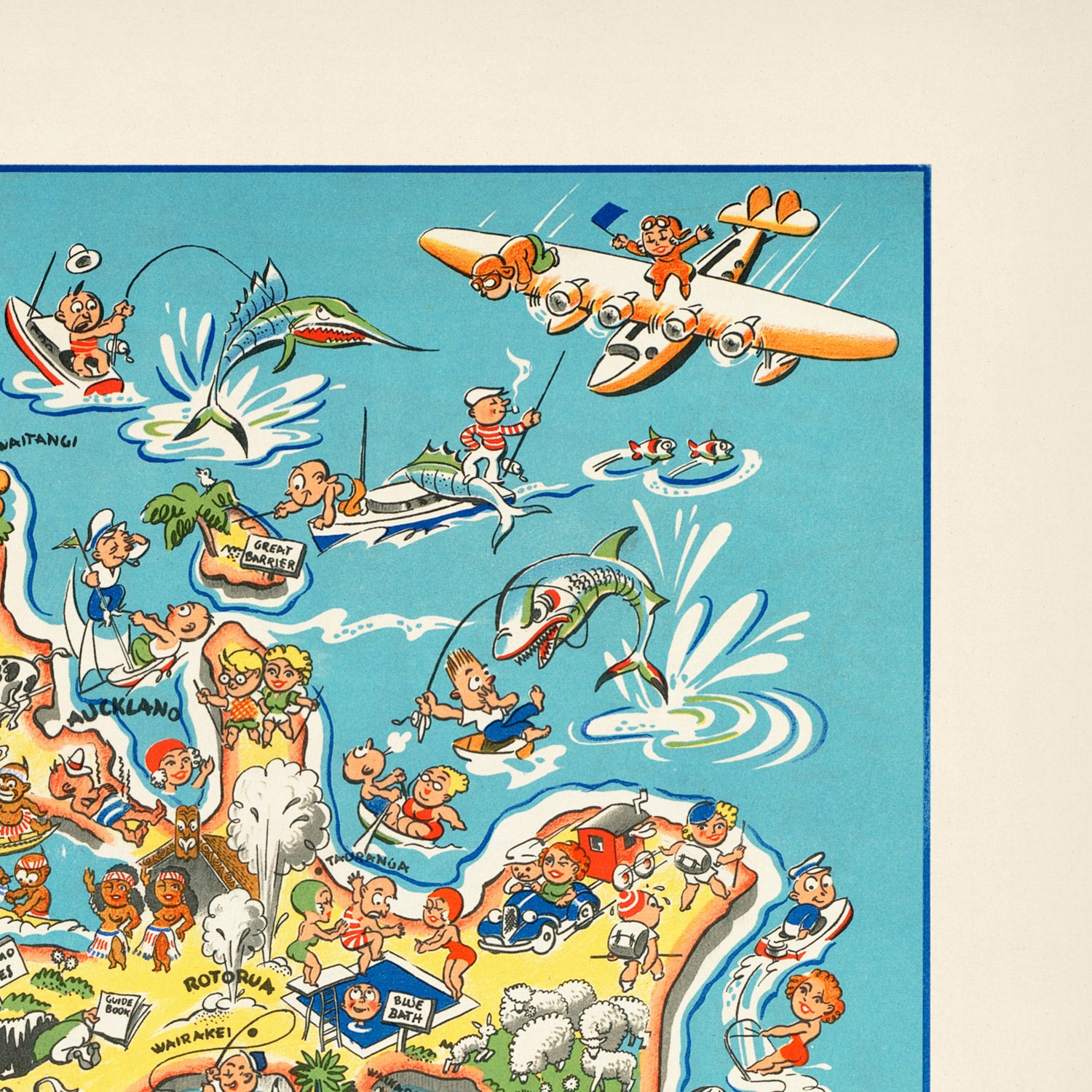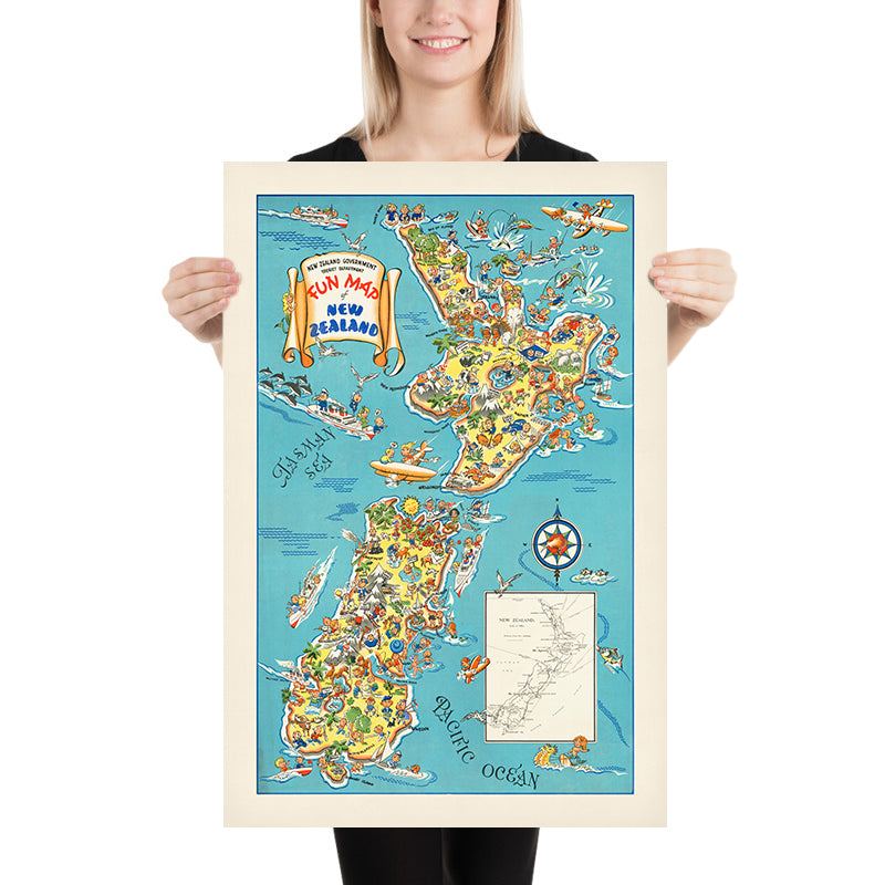 While the specific artist is uncredited, posters like this were typically drawn by talented commercial illustrators working for national tourism departments. Their brief was simple: make travel irresistible. Here, the artist uses crisp black linework, buoyant caricatures, and a clean map layout to blend information with fun. A compass rose crowned by a bright orange fish and an inset monochrome map labeled New Zealand anchor the whimsy with classic cartographic touches.