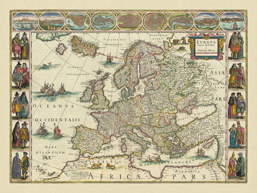 Old Map of Europe by Willem Blaeu, 1630: Dutch Masterpiece, Cultural Illustrations, Mythical Elements