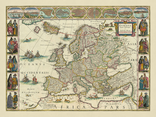 The map is not just a geographical representation but a rich tapestry of cultural and historical elements. The upper border features nine prominent European towns—Amsterdam, Prague, Constantinople, Venice, Rome, Paris, London, Toledo, and Lisbon—each illustrated in an oval frame, offering a bird’s eye view of their unique characteristics. These cityscapes provide a glimpse into the urban landscapes of the 17th century, complete with rivers and sprawling settlements. This artistic approach highlights the importance of these cities as centers of commerce, politics, and culture during the period.