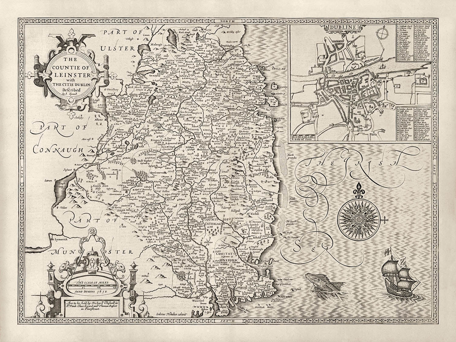This old, monochrome and wonderful map shows the ancient Irish province of Leinster as it was in 1611. It was created by John Speed and engraved by Jodocus Hondius, and originally published in Speed's "The Theatre of the Empire of Great Britaine".