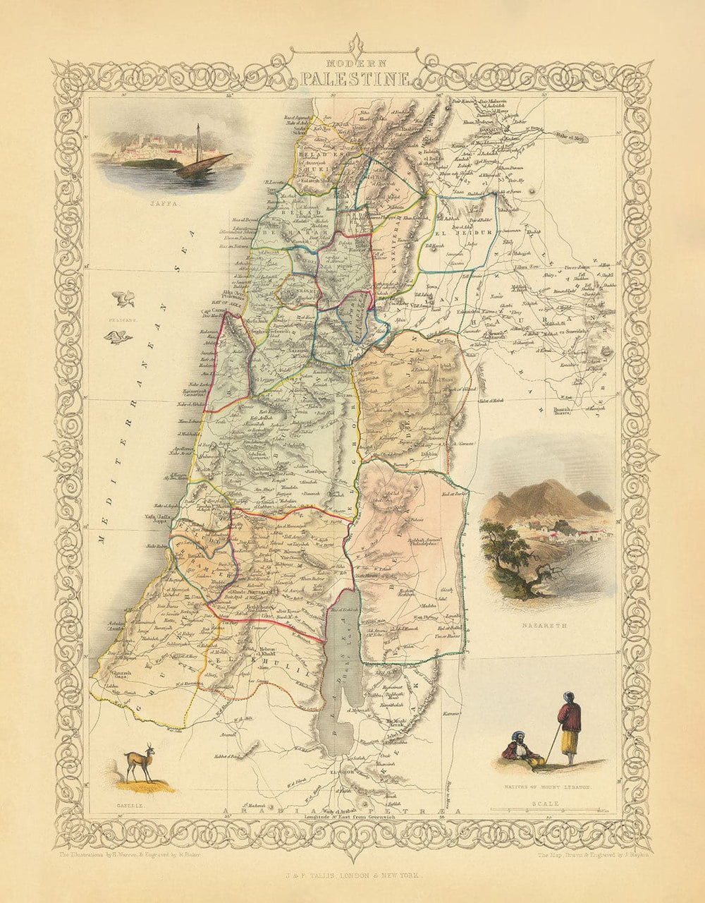 Engraved by John Rapkin and published by J. Tallis & Co in 1851, this is one of the finest and most detailed maps of the region of Palestine - the area that today includes Israel, Palestine, Gaza, West Bank and parts of Jordan. Please note, Israel is not mentioned or labelled on this map.