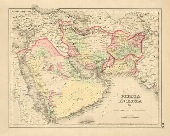 Step into the intricate world of 19th-century cartography with "Persia Arabia &c.," a masterwork published in 1857 by the renowned Joseph Hutchins Colton. This exquisite map, produced in New York at the height of Colton’s career, captures the vast and enigmatic landscapes of the Middle East, stretching from the heart of Persia to the sweeping deserts of Arabia and the storied shores of the Persian Gulf. Colton’s signature decorative border and delicate pastel hues frame a region in flux, offering a rare glimpse into a time before the seismic geopolitical shifts that would redefine these lands in the decades to follow.