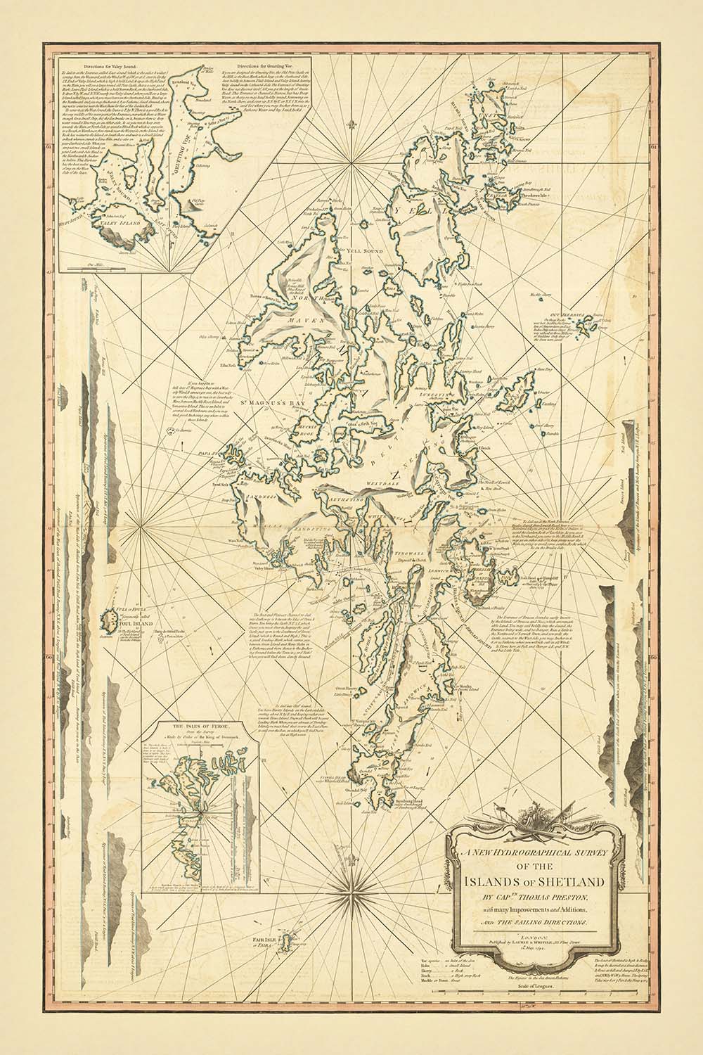 Laurie & Whittle, heirs to the London chart‑publishing tradition and successors to Robert Sayer’s imprint, excelled at fusing scientific exactitude with visual grace. Issued at the cusp of Britain’s global maritime ascendancy, this Shetland survey channels the on‑the‑spot precision of Thomas A. Preston’s earlier fieldwork into a refined engraved synthesis, adding the publisher’s characteristic clarity of lettering and ornament. Profile views—an 18th‑century specialty—were prized by navigators long before universal chronometers and accurate longitudes took hold; a skyline recognized at distance could save ship and cargo. The result is a working document equally suited to naval patrols, herring and whaling fleets, and merchantmen threading routes between Scotland, Norway, and the northern fishing grounds.