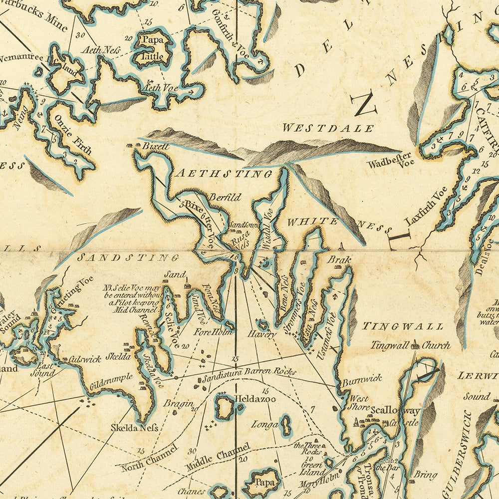- Historical Significance: This map is significant for maritime navigation in the era, helping sailors safely navigate the treacherous coastal waters of the Shetland Islands.