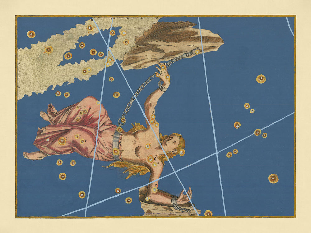 Johann Bayer was a pioneering astronomer whose work in celestial cartography left an indelible mark on the field. His Uranometria atlas, first published in 1603, was groundbreaking for its inclusion of both northern and southern hemisphere constellations, a feat never before accomplished with such precision and artistry. This particular chart illustrates the stars in the constellation Andromeda, using a magisterial form that blends scientific accuracy with mythological elegance.