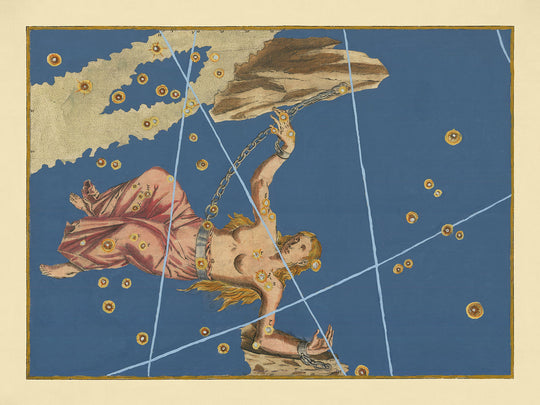 Introducing "Old Star Map of Andromeda" by Johann Bayer, a captivating piece of celestial art originally published in 1603. This stunning handcoloured star chart, rich in historical significance, features the constellation Andromeda mapped out in detail.