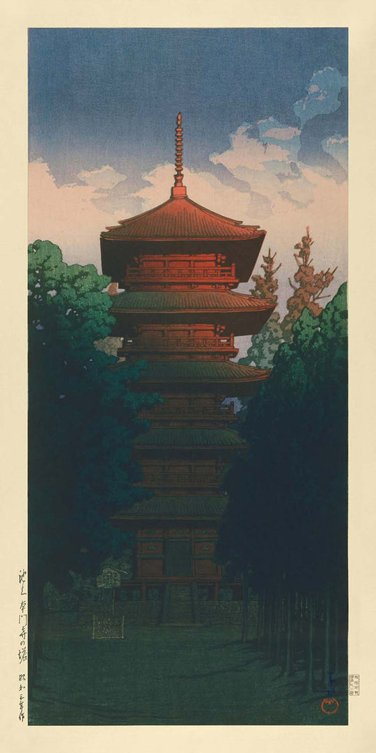 Hasui Kawase's work is notable for capturing the fleeting beauty of nature, and this print exemplifies that through its lush depiction of greenery punctuated by subtle red accents, drawing the eye towards the temple. The artist’s choice of soft greens creates a calming effect, while the understated use of red highlights the architectural beauty of the pagoda without overpowering the landscape. The juxtaposition of traditional and contemporary elements in his artwork makes this piece a timeless yet modern choice for art enthusiasts.