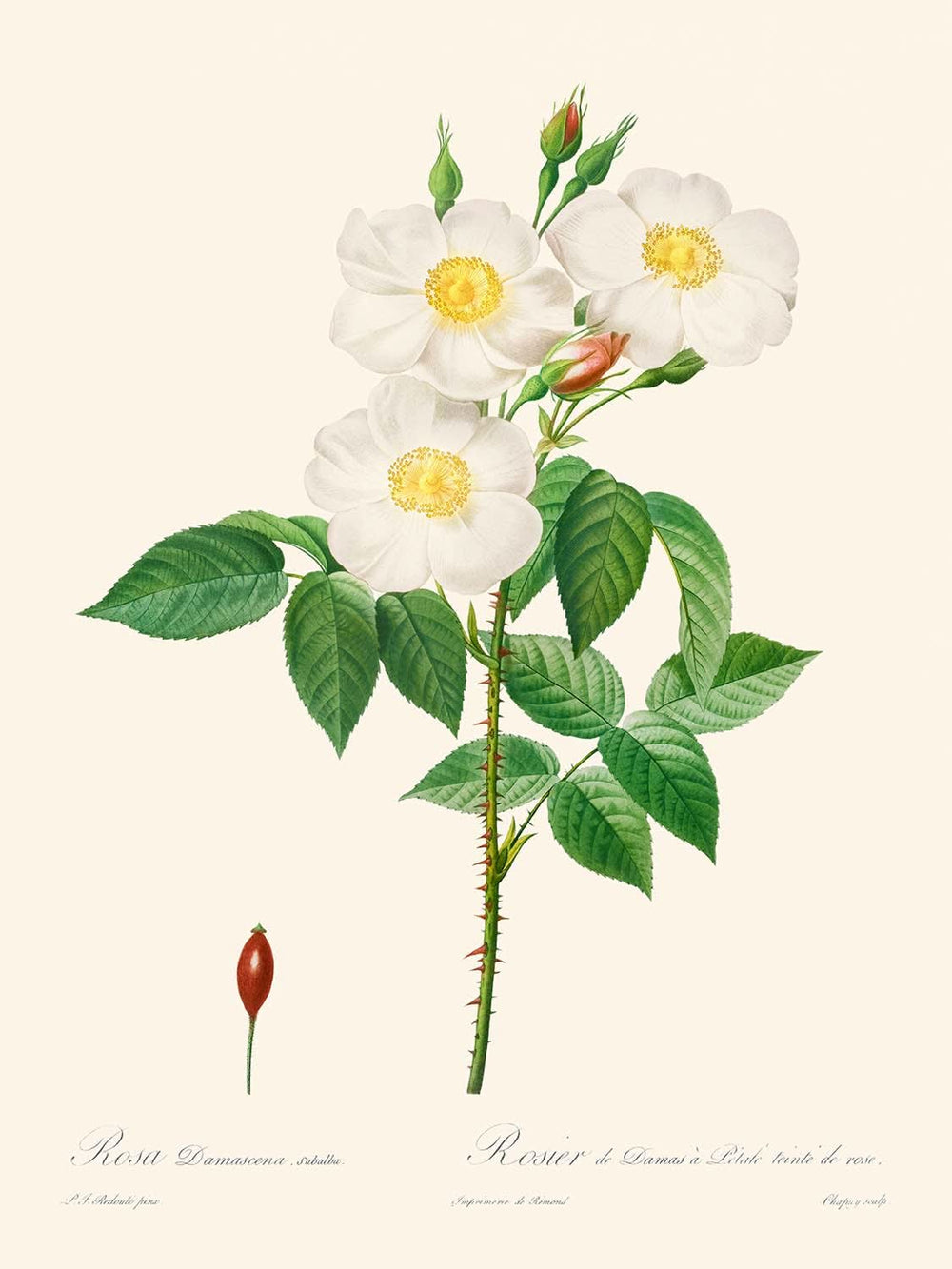 Rosa Damascena, Subalba by Pierre-Joseph Redouté, 1817