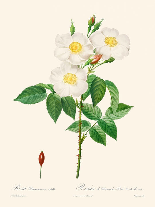 Rosa Damascena, Subalba, created by Pierre-Joseph Redouté in 1817, is a stunning Victorian botanical illustration that captures the ephemeral beauty of the Damask Rose. Born in Belgium, Redouté is lauded as one of the finest botanical illustrators in history. His illustrious career includes being the painting tutor to Marie Antoinette and producing an extensive collection of floral paintings under the patronage of Josephine Bonaparte at Château de Malmaison. His dedication and exquisite attention to detail are evident in this artwork, originally part of his renowned publication, "Les Roses."