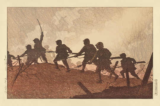 Soldier Assault (Totsugeki), created by Hasui Kawase in 1935, stands as a dynamic example of early 20th-century Japanese woodblock printing. Known in Japanese as 「突撃」, this piece captures the exhilarating moment of a military advance with poignant detail and emotional tension. Kawase was an eminent figure in the shin-hanga (“new prints”) movement, revered for his ability to blend traditional printmaking techniques with poignant visual storytelling, marrying the power of realism with the lyricism of Edo-era ukiyo-e prints.