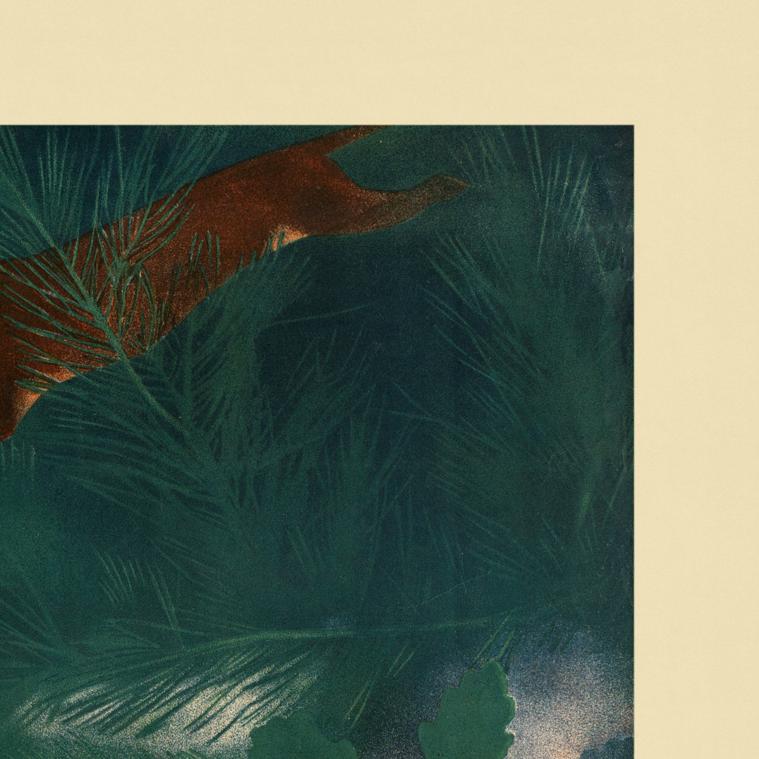 What makes this design so compelling is its choreography of color and movement. A vivid orange fox—recognizable as the red fox, Vulpes vulpes—arcs across a field of deep greens and earth-browns, its form streamlined into confident curves that suggest speed and alertness. Soft gradients and abstract foliage float behind the animal, while strong outlines and assertive Cyrillic typography anchor the composition. The palette feels both rustic and modern: green tones evoke forest shade, brown adds warmth, and the fox’s saturated orange becomes a magnetic focal point. Hung in a contemporary living room, study, or cabin, it delivers a crisp graphic punch with a storied past.