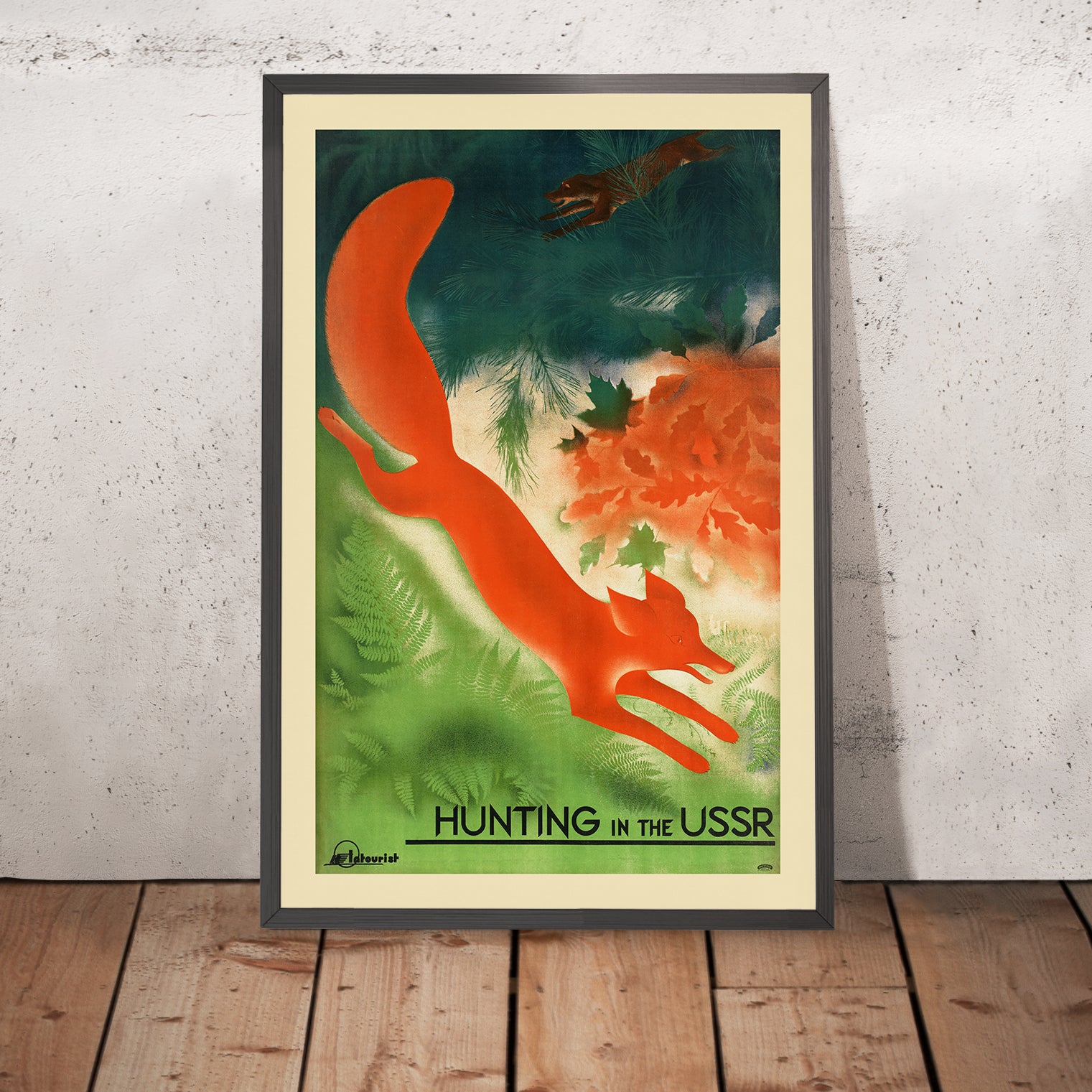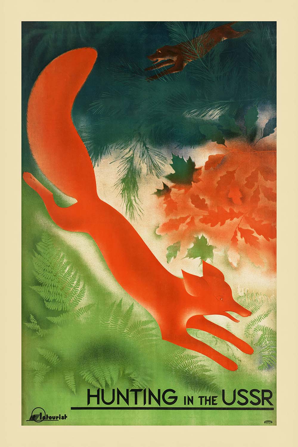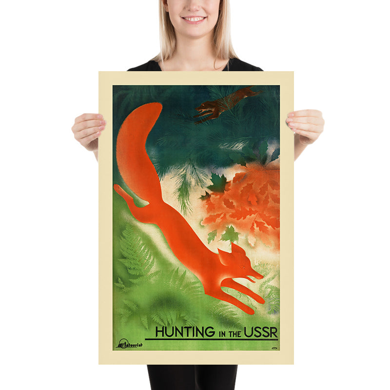 Hunting in the USSR is a striking Soviet-era travel poster by an unknown studio artist, created at a time when bold, modern graphics carried the nation’s message across rail stations, travel bureaus, and city streets. Distilling the spirit of adventure into a single, unforgettable image, the poster celebrates the vast landscapes of the Soviet Union—its forests, taiga, and steppe—inviting travelers and citizens alike to experience the outdoors. With its dynamic composition and powerful color contrasts, it channels the avant-garde energy of the interwar years, when posters for leisure, tourism, and sport were instruments of both inspiration and state promotion.