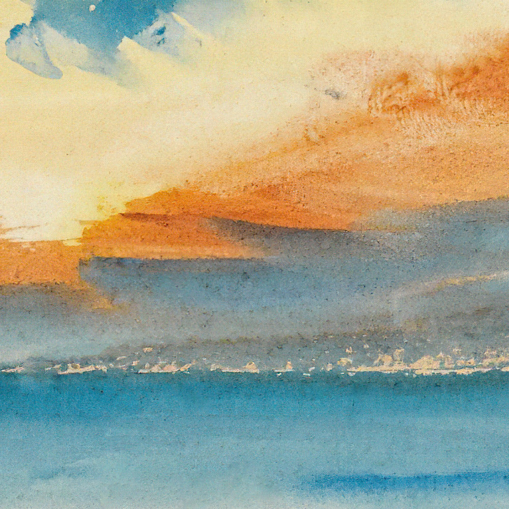 Color and technique are the heart of this work. A lemon-tinged sun glow diffuses across the upper register, warming into amber and soft orange, then cooling to blue in the water below. Loose, confident brushwork and delicate watercolor transitions create seamless gradients; the clouds seem to move, the horizon breathes, and shapes dissolve into pure atmosphere. This elegant restraint makes the print exceptionally versatile for interiors, introducing warmth and serenity to living rooms, bedrooms, and quiet reading corners alike.