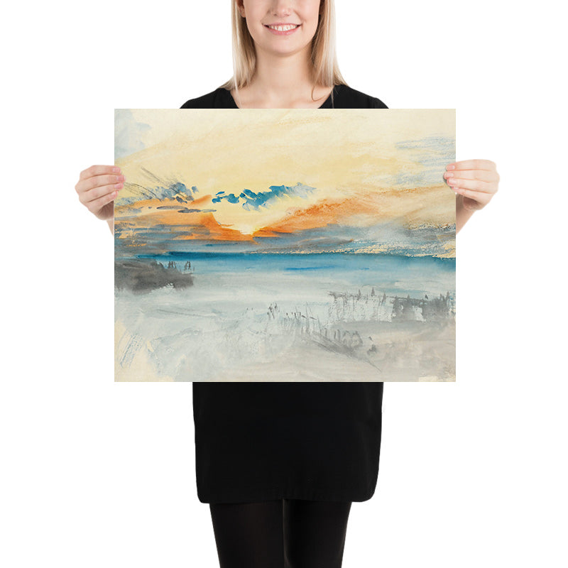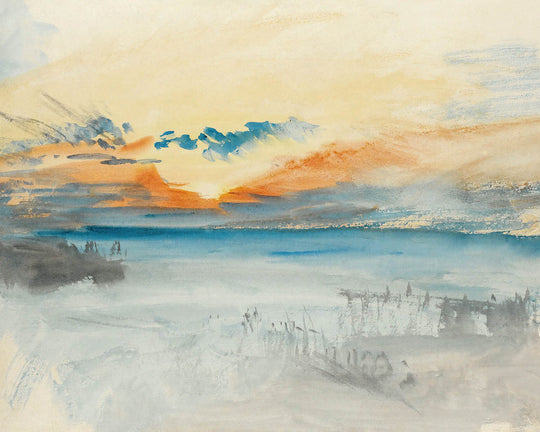Sunset Over Water by Turner, 1820, captures the Romantic era’s deep attachment to nature and feeling, distilled into a single, glowing horizon. Painted during a period when Turner was refining his visionary approach to light, this seascape submerges the viewer in atmosphere rather than topography: a sky awash in pale yellow and soft orange sinks into tranquil blue water, while vaporous clouds drift across a dissolving horizon line. The effect is contemplative and immersive—an invitation to linger in the quiet drama of evening.