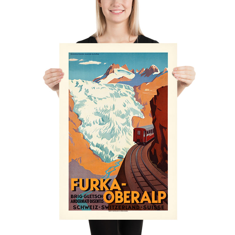 Why this subject matters: The Furka–Oberalp route threads through Andermatt toward Disentis/Mustér and Brig, traversing high passes and glacier country at the heart of the Swiss Alps. It’s a line intertwined with the mythos of the Glacier Express, carrying winter skiers and summer hikers past snowfields, deep valleys, and crystalline light. For anyone who has stood on a wind-bright platform at Oberalp Pass or watched the sun fall across the Rhone valley, this poster is more than décor—it’s a vivid reminder of the journey.