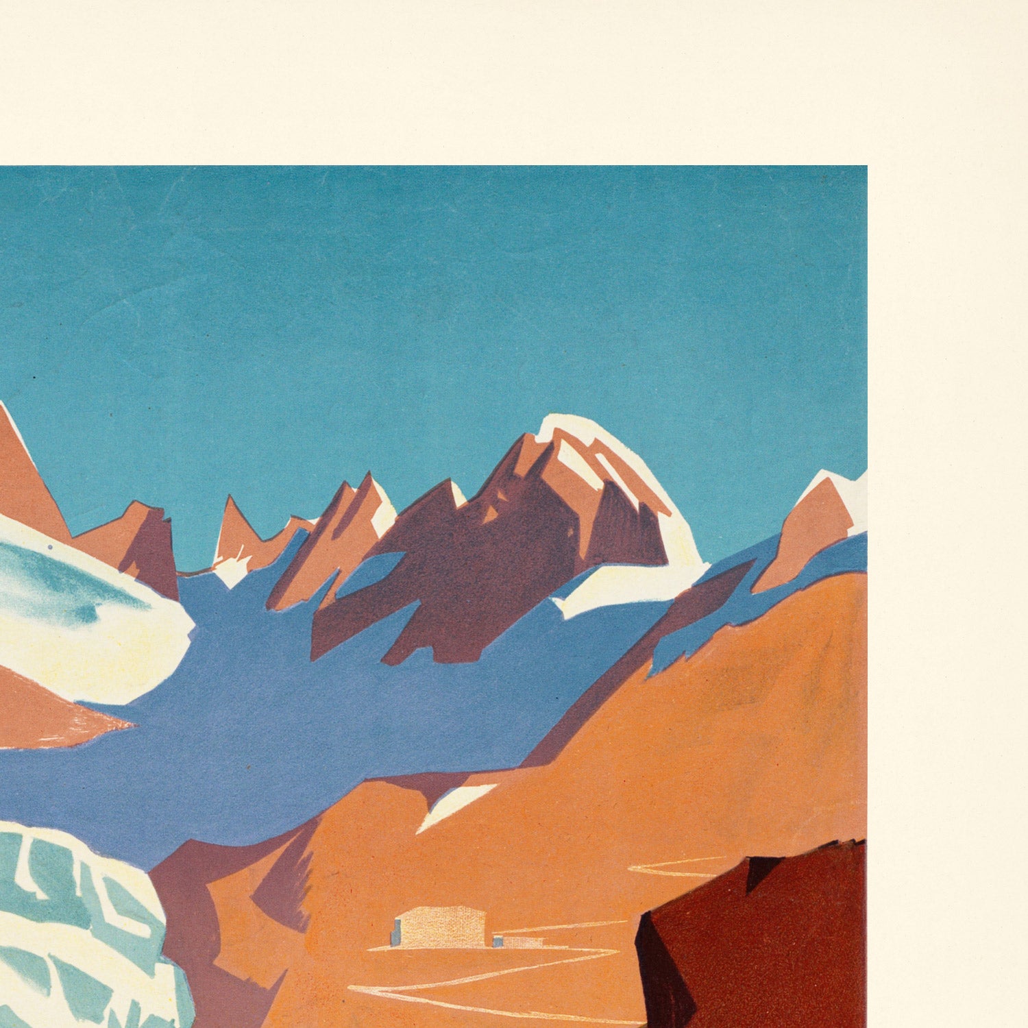About the maker and tradition: While the exact artist of this Furka-Oberalp poster is unknown, it sits squarely in the Swiss poster tradition that flourished from the 1920s through the mid-century, when railway companies commissioned striking lithographs to entice travelers. Designers favored clean geometry, flat fields of color, and confident sans-serif typography—an aesthetic that helped establish Switzerland’s reputation for clarity and precision in graphic design.