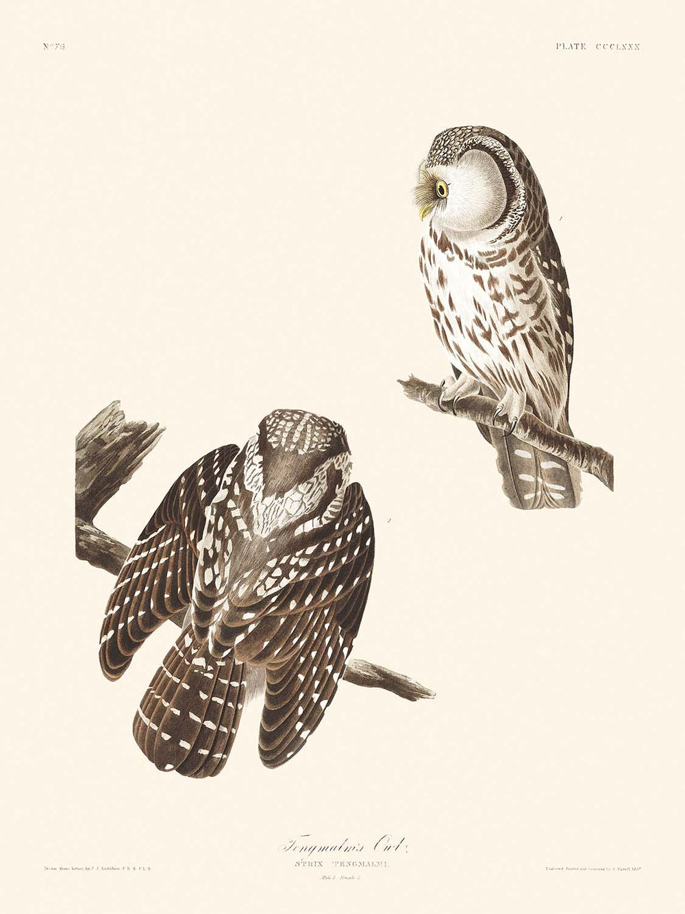 John James Audubon's substantial contributions to ornithology and art have immortalized him as a pioneering figure in both fields. His ability to capture the beauty and complexity of avian species makes this artwork notable and desirable for nature lovers and art collectors alike. "Tengmalm's Owl" in particular was highlighted for its realistic portrayal of this owl's unique behaviors, as noted in the detailed field accounts accompanying Audubon's work.