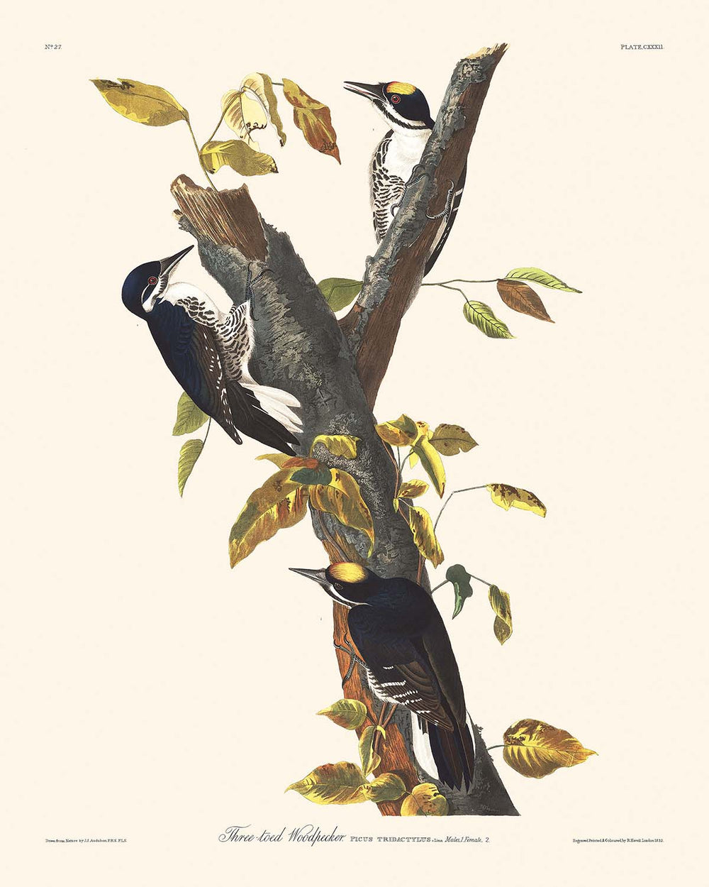 John James Audubon was a pioneering figure in ornithology and art, known for his extraordinary ability to combine scientific accuracy with artistic splendor. His innovative techniques in depicting birds in lifelike poses amid lush settings set a new standard for wildlife art. "Three-toed Woodpecker" stands as a testament to Audubon’s legacy, showcasing the woodpecker in a dynamic pose against a serene background, drawing attention to its distinct plumage.