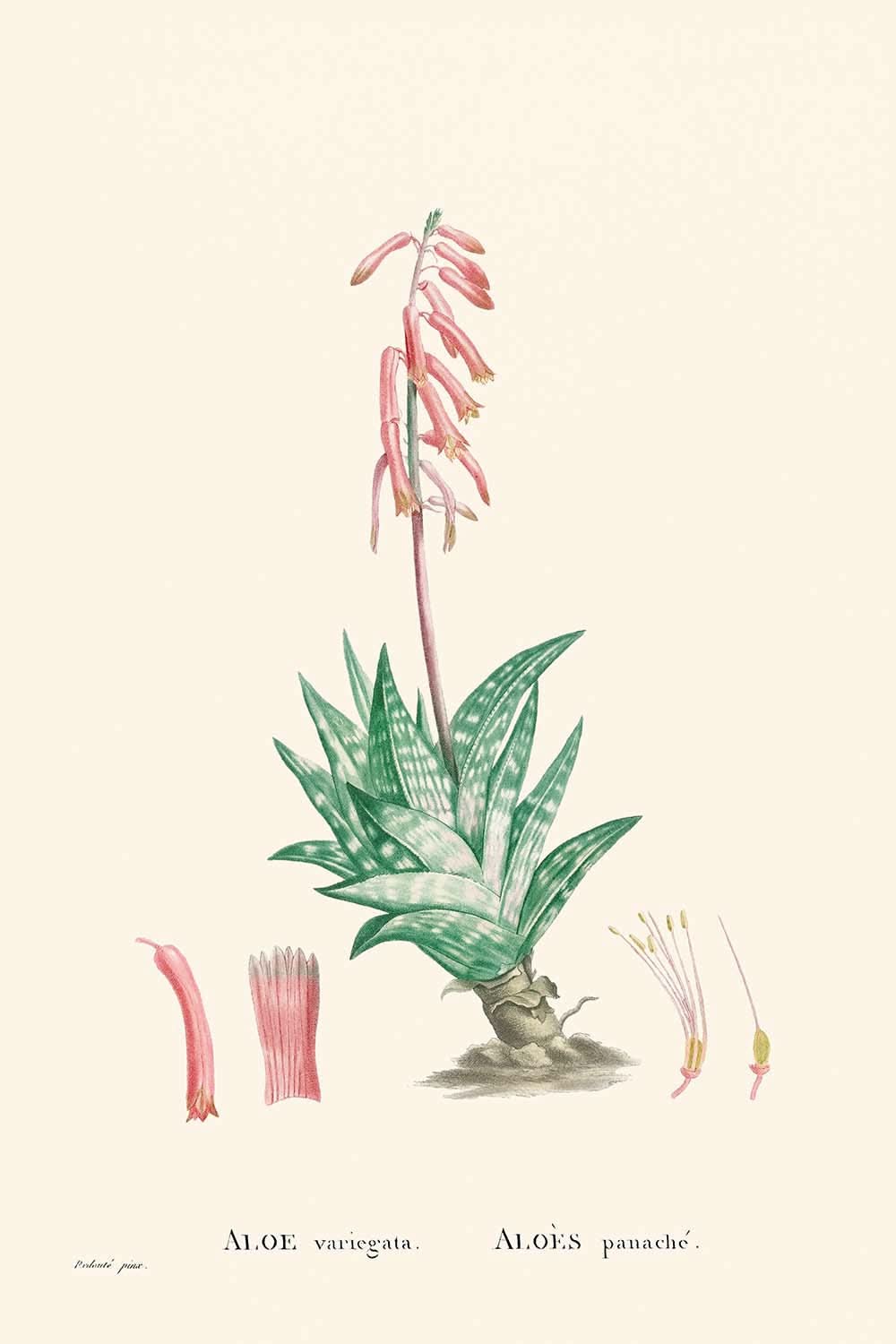 The "Aloe Variegata", commonly known as Tiger Aloe, is depicted with remarkable accuracy and vibrancy. This botanical gem is celebrated not only for its aesthetic appeal but also its scientific precision. Redouté's art is characterized by the intricate use of color and style, capturing the essence of the subject with elegance and clarity.