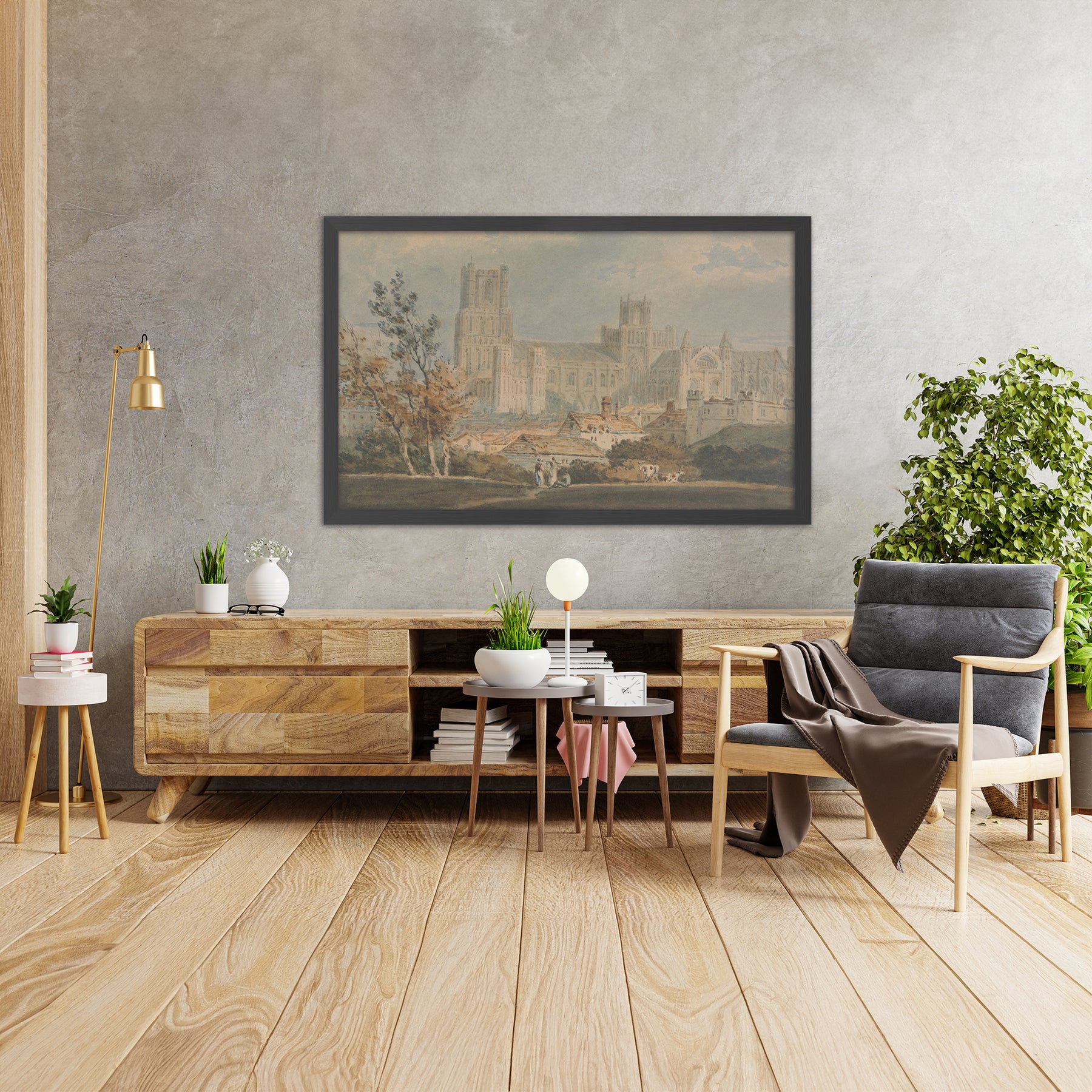 The subject itself—Ely Cathedral—is a touchstone of English heritage, its medieval fabric long celebrated for both scale and intricacy. Turner’s portrayal reflects the Romantic ideal: a storied structure embraced by nature, with small human presences and rural buildings providing a gentle narrative of everyday life. In an age increasingly shaped by industrial progress, this image preserves a slower rhythm and a close bond between community, land, and monument.