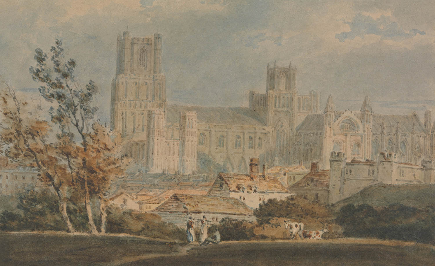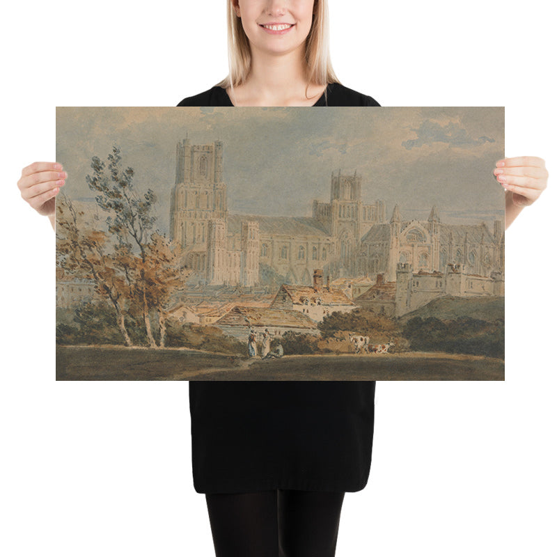 View of Ely Cathedral by Joseph Mallord William Turner (1796) captures a majestic Gothic landmark rising above the low, pastoral sweep of the Cambridgeshire fens. Painted early in Turner’s career and steeped in the Romantic spirit, this scene pairs architectural grandeur with a quietly breathing landscape. The cathedral’s articulated towers and buttresses stand against a luminous sky, while soft light threads through trees and village roofs to evoke a mood of reflection and awe.