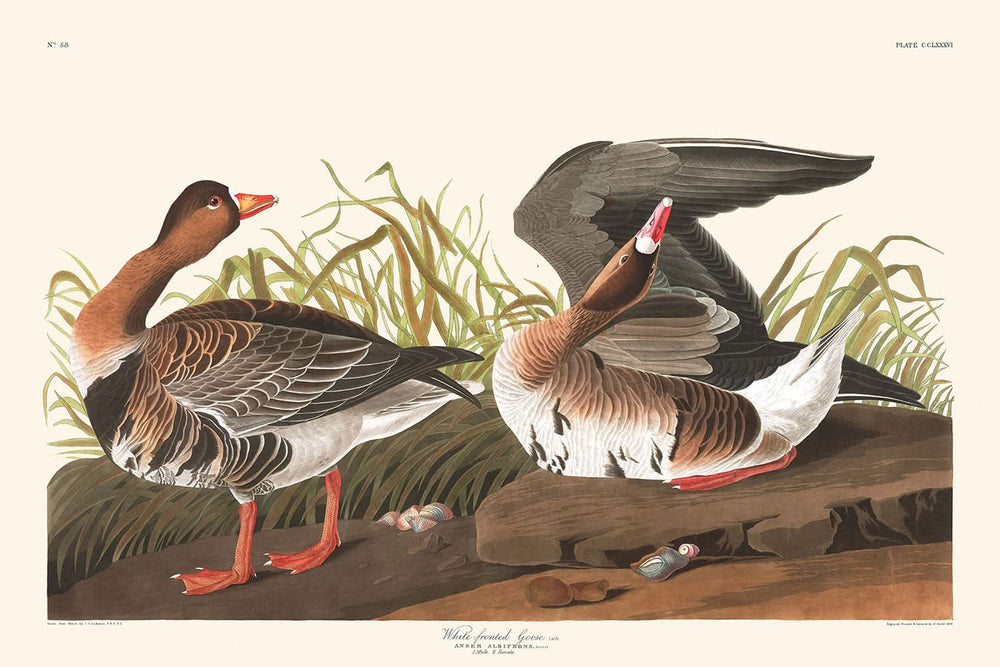 Audubon’s expertise in detailing plumage, such as the rich greyish-brown neck and deep grey body of the White-fronted Goose, adds visual depth to this composition. The bird’s depiction, with its carmine-red bill and orange feet, stands as an evocative representation of American wildlife and a reminder of Audubon’s lifelong passion for the natural world.