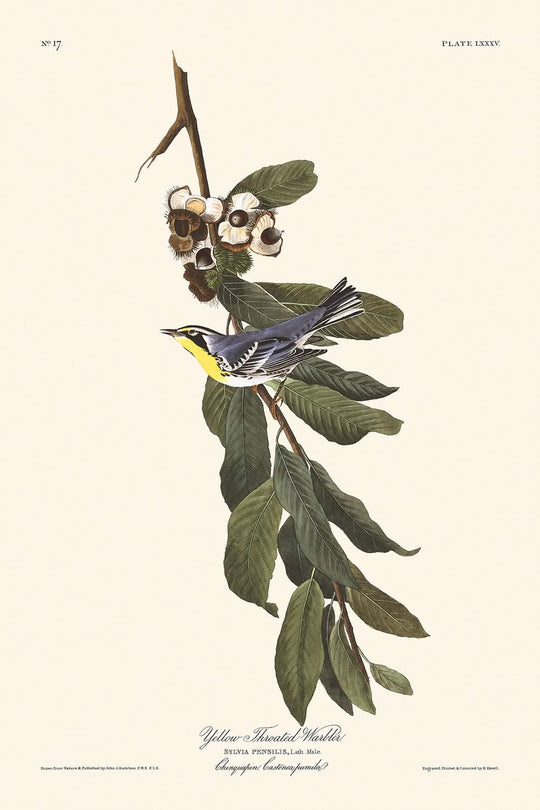 Yellow Throated Warbler, crafted by the renowned John James Audubon, is an exquisite illustration from his seminal collection, Birds of America, first published in 1827. Audubon's dedication to capturing the vibrant essence of avian life shines through in this stunning portrayal of the Yellow Throated Warbler.