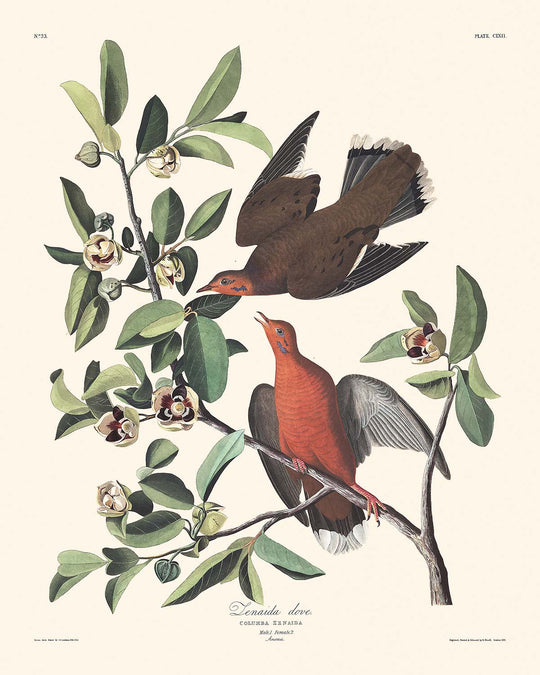 "Zenaida Dove" by John James Audubon is a captivating piece from his acclaimed series "Birds of America," created in 1827. This exquisite illustration unveils the subtle beauty and serene elegance of the Zenaida Dove, also known scientifically as Columba Zenaida. Audubon, an extraordinary naturalist and artist, is famed for his detailed portrayal of North American birds, a testament to his keen observation and artistic prowess.