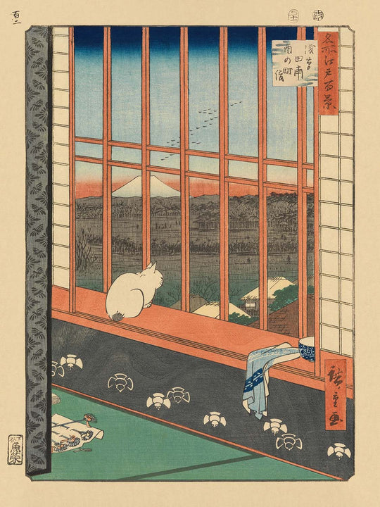 This exquisite woodblock print, "Cat on Windowsill (Watching the Festival)" by Utagawa Hiroshige, captures a charming and contemplative moment set against the vibrant backdrop of Edo-period Japan. Created in 1857, the artwork depicts a serene white cat sitting gracefully on a windowsill, quietly observing the bustling procession of the Festival of the Cock as it winds through the Asakusa rice fields. Hiroshige, renowned for his unparalleled ability to evoke atmosphere, seasons, and subtle moods, masterfully conveys a sense of quiet intimacy juxtaposed with the lively, festive scene unfolding beyond.
