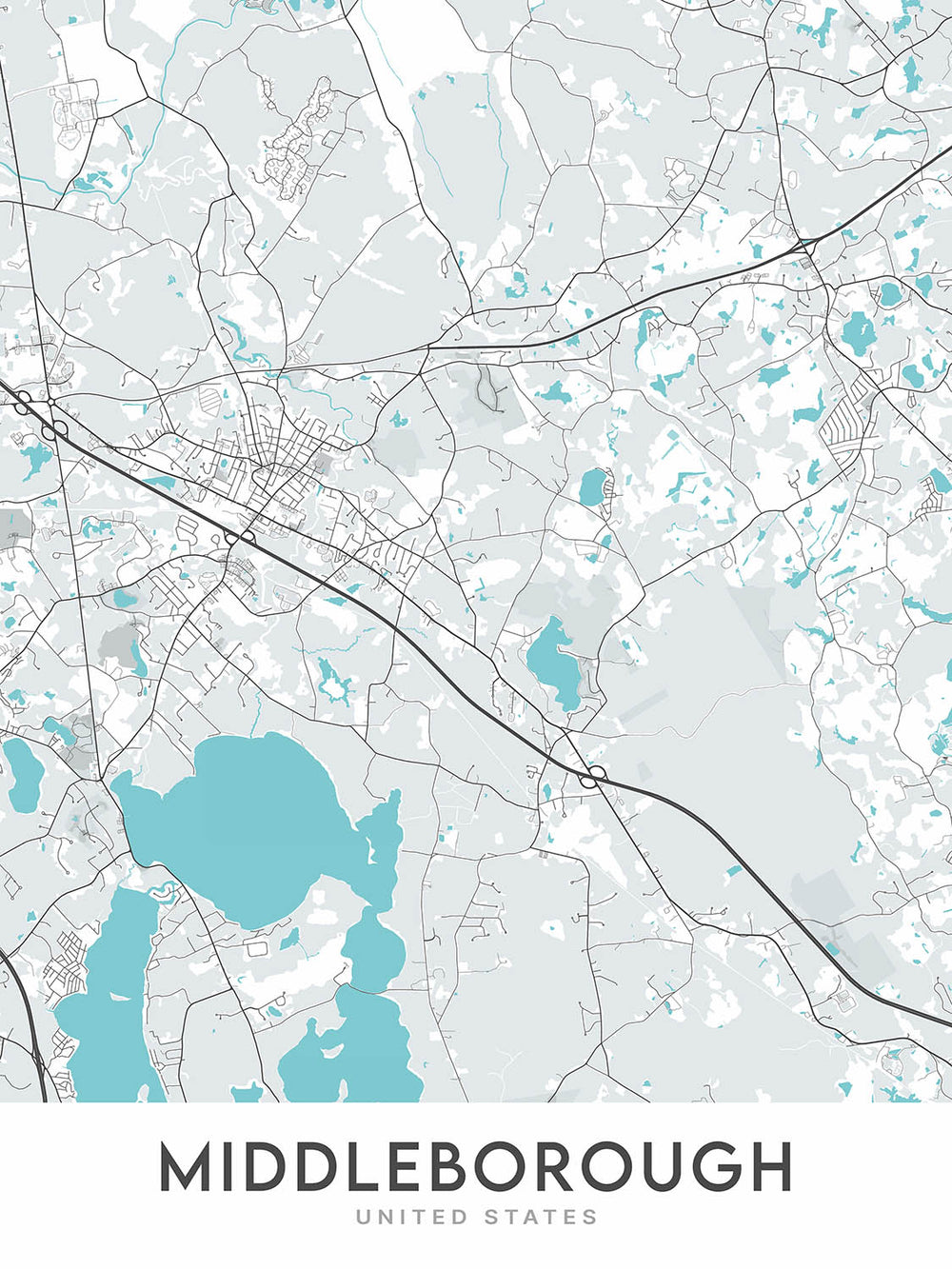 The Middleborough map is a modern cartographic masterpiece that captures the essence of this charming town in Massachusetts. This meticulously crafted map is a visual treat, featuring intricate details and a contemporary design that will complement any home or office space. The map's focus is on the town of Middleborough, with its distinct neighborhoods, significant landmarks, and the surrounding areas that contribute to its unique character.