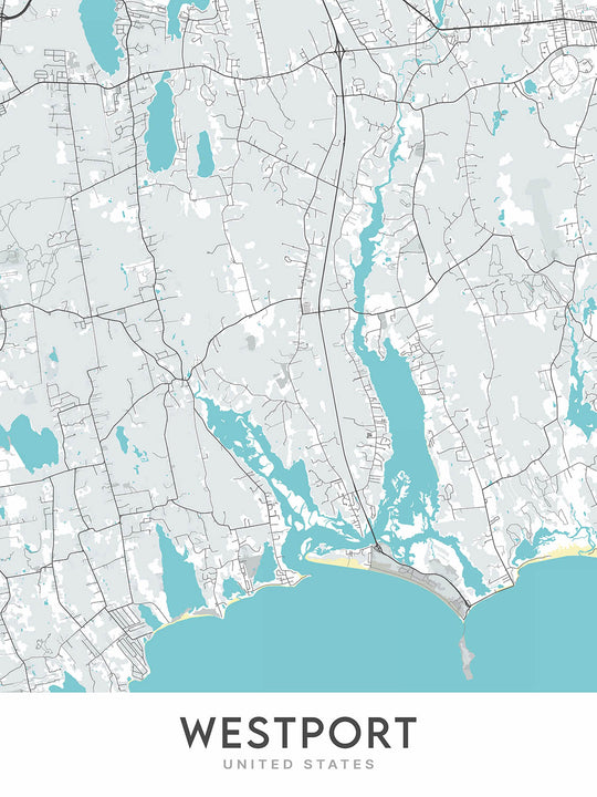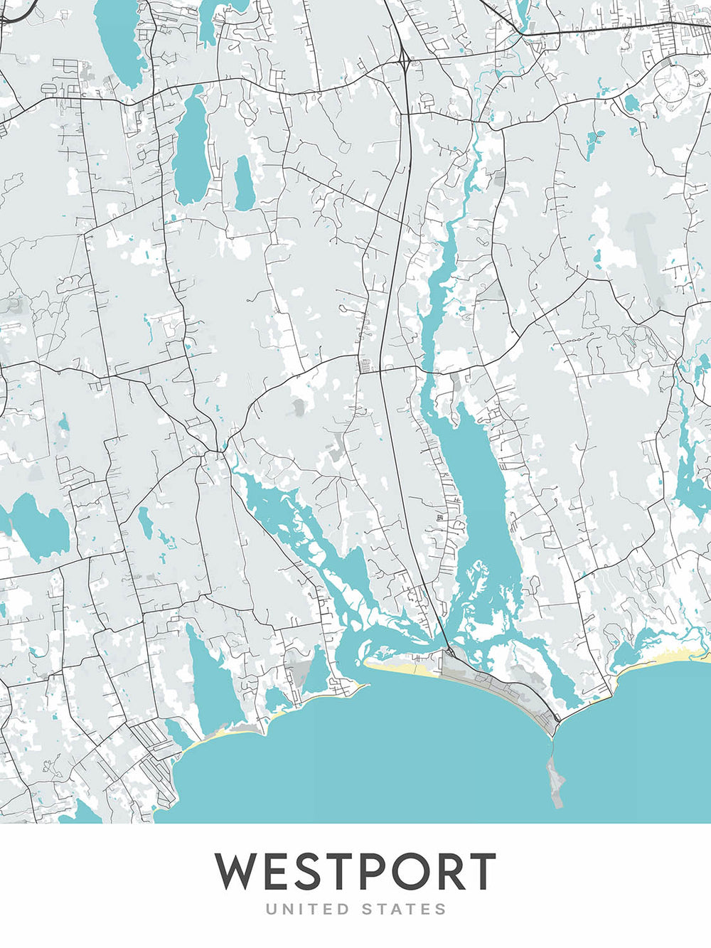 The Westport map is a modern, detailed street map of the city without labels. It focuses on the city's unique cartography, modern design, and unique colorways. The map covers a large area, including the city center, as well as several surrounding neighborhoods and towns. Some of the notable neighborhoods included in the map are Central Village, Head of Westport, North Westport, Westport Point, and Westport Harbor. The towns of Adamsville, Horseneck Beach, and Westport are also included.