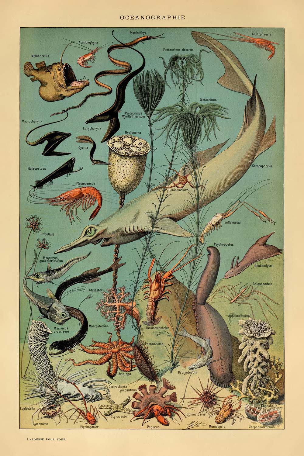 Oceanography by Adolphe Millot is a superbly detailed Victorian zoological illustration, first published in 1890 for the celebrated French encyclopedia “Le Larousse pour tous: nouveau dictionnaire encyclopédique”. In this vibrant and meticulously rendered print, Millot captures the astounding diversity found in the world’s oceans, depicted through an array of zoologically accurate marine species. Each creature is labeled in French, creating an artwork that functions both as a scientific record and as a work of art—a hallmark of Millot’s renowned career as a scientific illustrator.