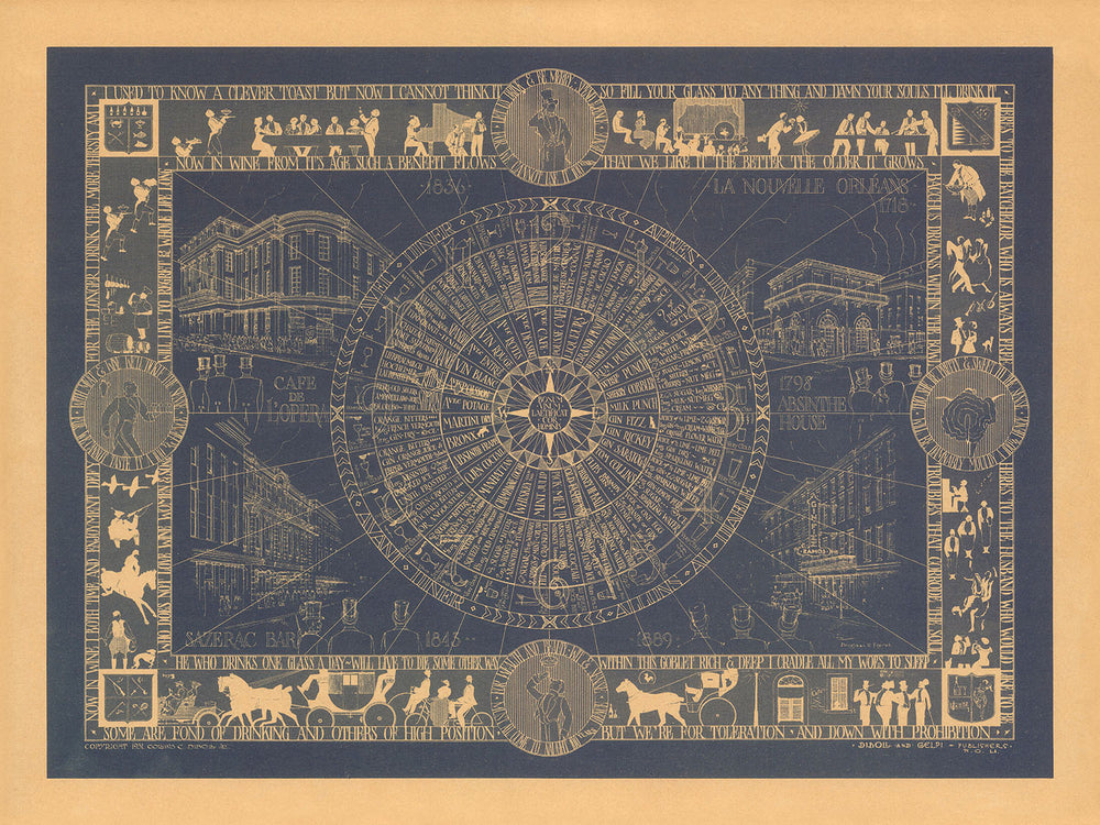 "The HOW, WHEN and WHERE of Discriminating and Enjoyable Drinking" by Collins C Diboll, first published in 1931, offers a clever and elegant visual argument for the historic importance of alcohol in local culture, even amidst the prohibition era. This antique colour lithograph is anchored in the city of New Orleans with its long-cultured history of food and drink. Encompassed in the image is a central clock face surrounded by four famous bars, illustrating that no matter the time of day or night, a specific drink, complete with its recipe, stands ready for any moment. Accompanied by vignettes depicting dining, sport, and nightlife of the jazz age, the print includes quotes that encapsulate the spirit of the time, such as "Let Us Eat Drink & Be Merry-Spend our Pence-For We Cannot Use It 100 years Hence."