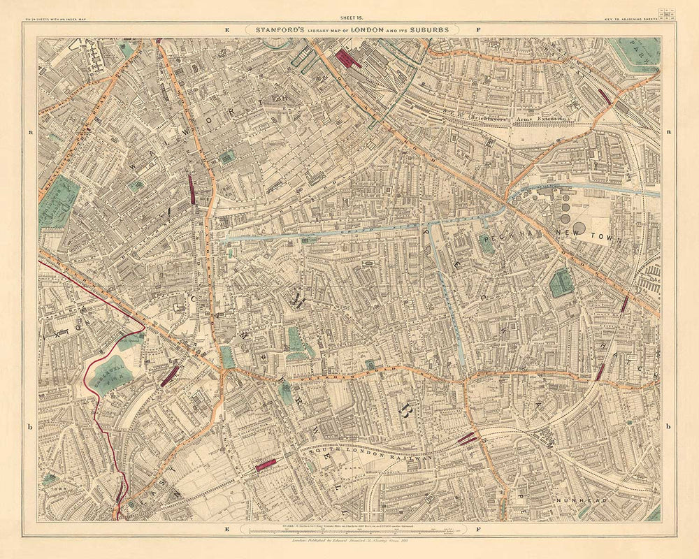 The map was originally published in 24 sheets. Altogether the map would've measured about 2 metres wide (78 inches). This here is sheet 15, which focuses on the south London borough of Southwark and the areas of Camberwell, Peckham, Nunhead, Walworth and Old Kent Road.