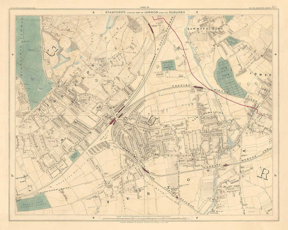 The map was originally published in 24 sheets. Altogether the map would've measured about 2 metres wide (78 inches). This here is sheet 21, which focuses on the southwest London boroughs of Merton, Wandsworth and Lambeth.