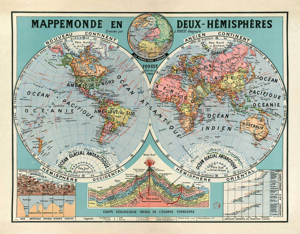 Old French Double Hemisphere World Map in 1925 by Joseph Forest: Volcanoes, Mountains, Ocean Floor