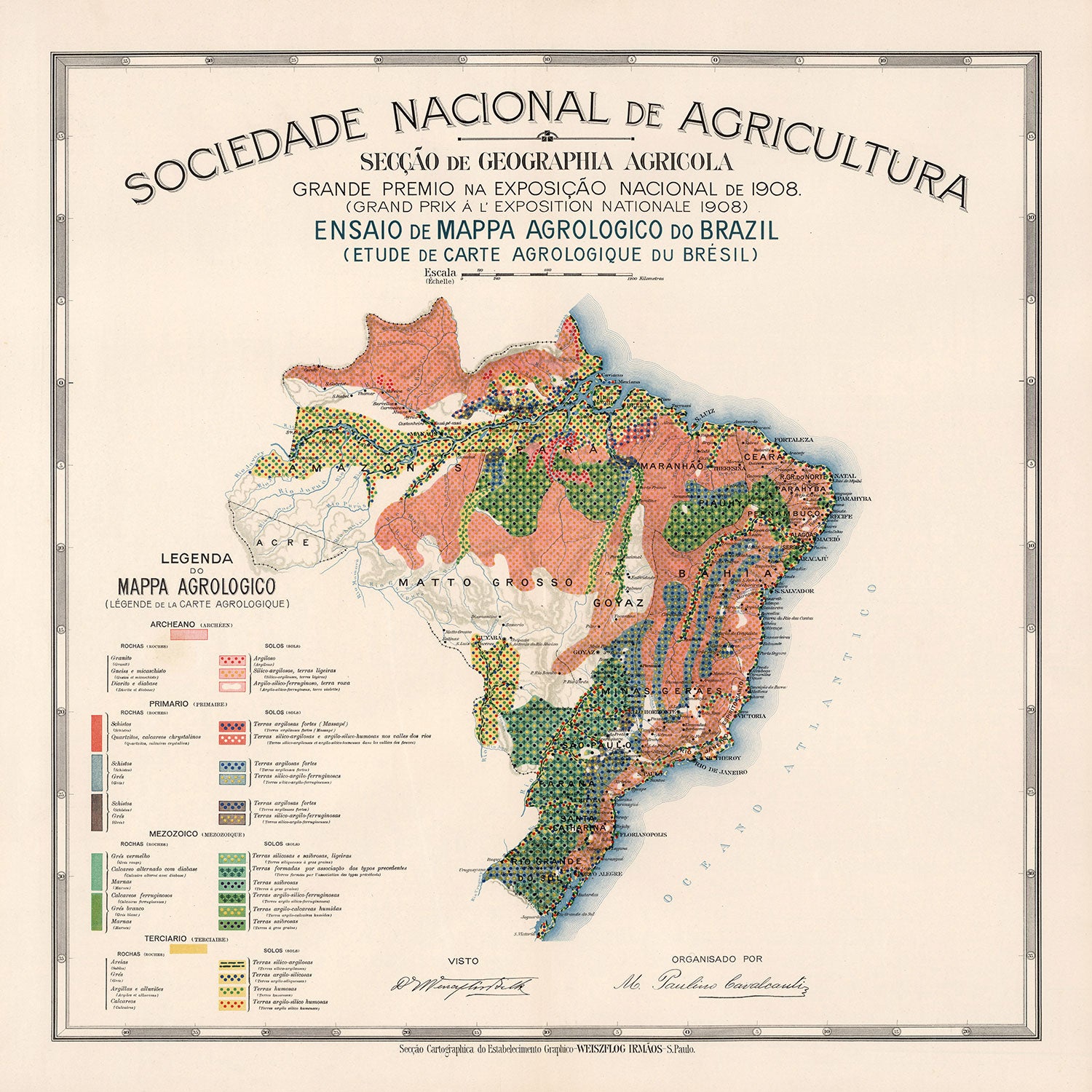 Old Map of Brazil Agrology, 1908: Agriculture, Geology, Rocks, Soil