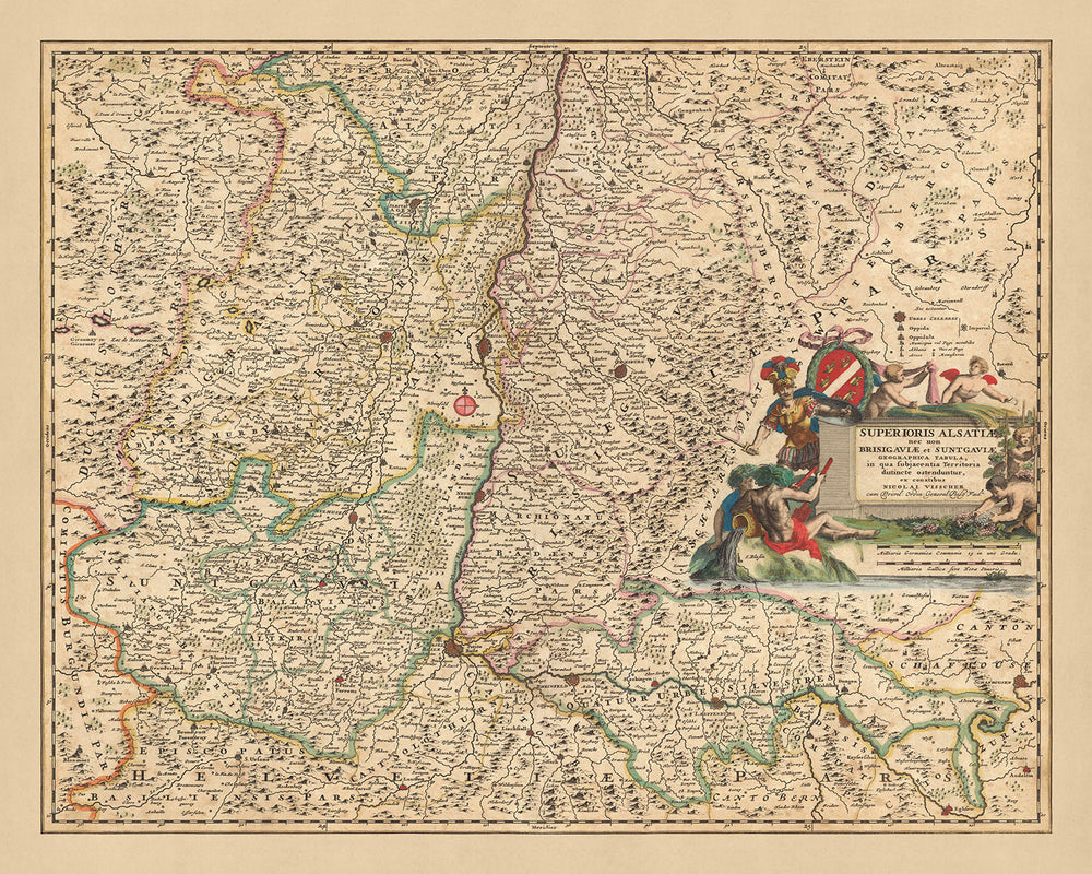 Old Map of Upper Alsace, Breisgau & Sundgau by Visscher, 1690: Basel, Freiburg im Breisgau, Colmar, Mulhouse, Jurapark Aargau