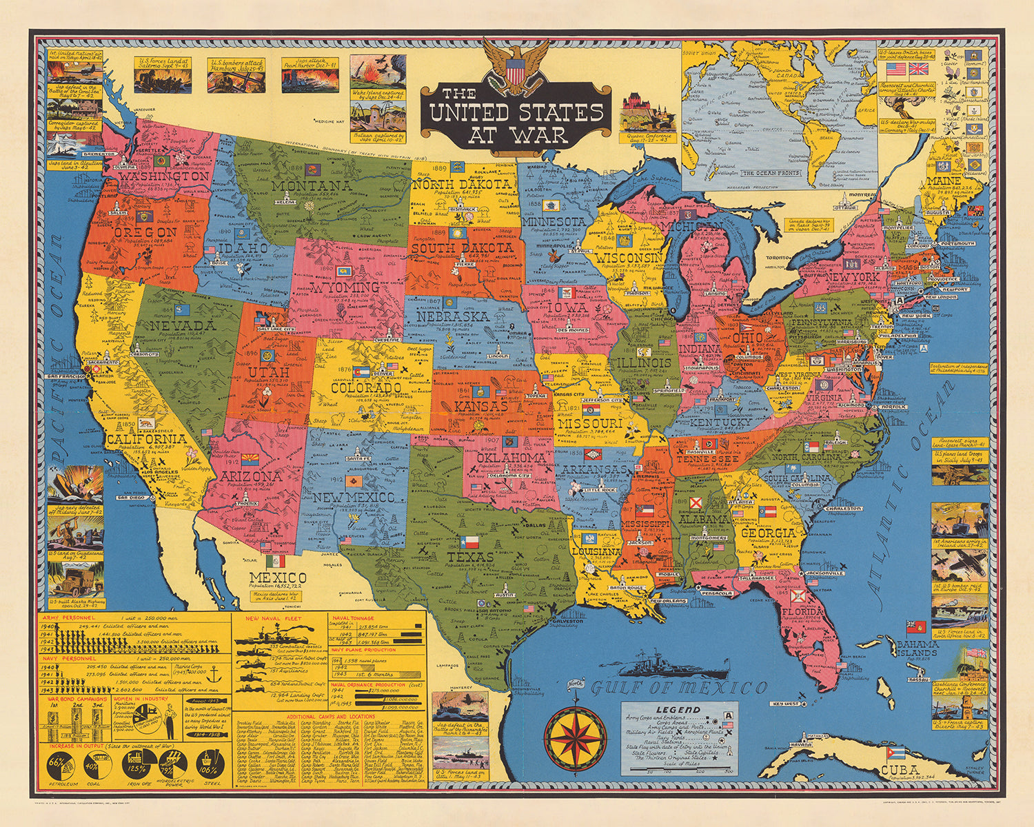 Old Map of USA at War by Stanley Turner, 1943: Domestic World War 2 Army & Navy Chart