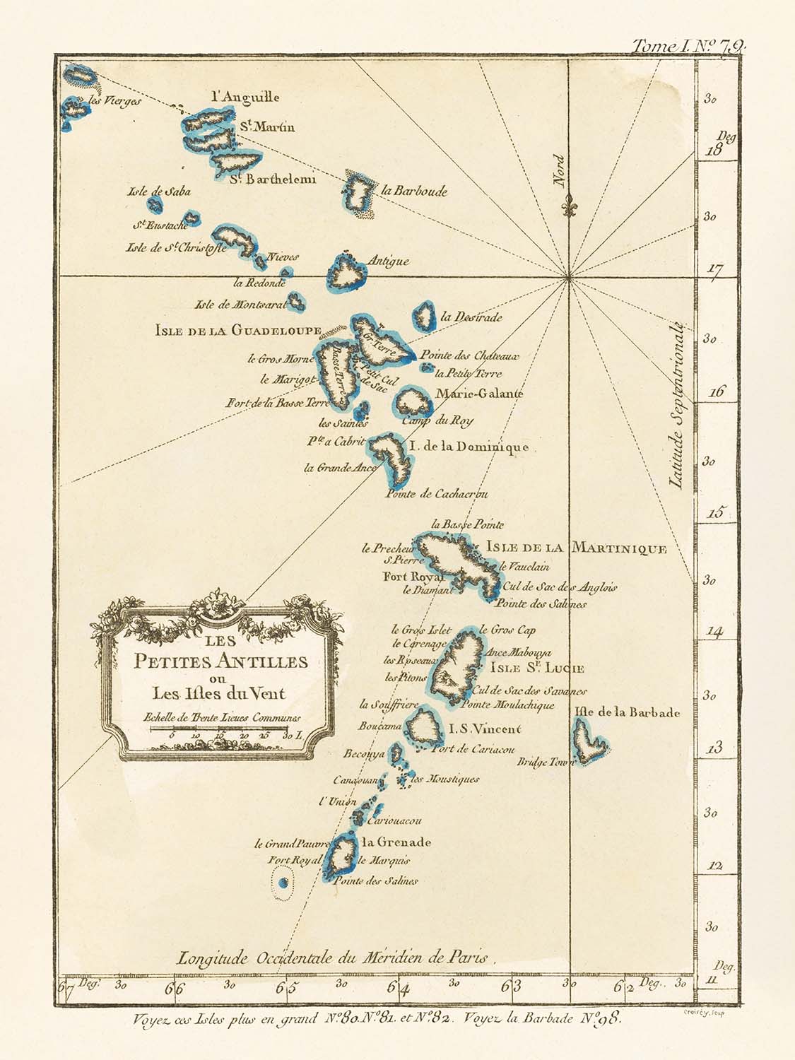 The map’s scope is remarkable, encompassing a constellation of islands that today form the heart of the Caribbean. Each island is crisply outlined and labeled, including Martinique, Guadeloupe, Saint Lucia, Saint Vincent, Dominica, Antigua, and more. These islands were, and remain, sites of immense cultural and historical significance—crossroads of commerce, conflict, and migration. The careful rendering of coastlines and maritime passages highlights the islands’ roles as both havens and hazards for ships, underscoring their importance in the era’s global trade networks.