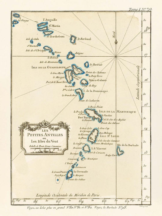 Step into the vibrant maritime world of the 18th century with “Les Petites Antilles ou Les Isles du Vent,” a masterwork by the renowned French cartographer Jacques Nicolas Bellin, dated 1764. This exceptional map elegantly charts the arc of the Lesser Antilles, or Windward Islands, capturing the critical corridor between the Atlantic Ocean and the Caribbean Sea. Bellin’s meticulous craftsmanship is evident in the clarity with which he delineates each island, from the storied shores of Barbados and Grenada in the south to the intricate cluster of the Virgin Islands and Saint Barthélemy in the north. The original French title, prominently displayed, evokes the era’s spirit of exploration and the strategic importance of these islands to European empires.